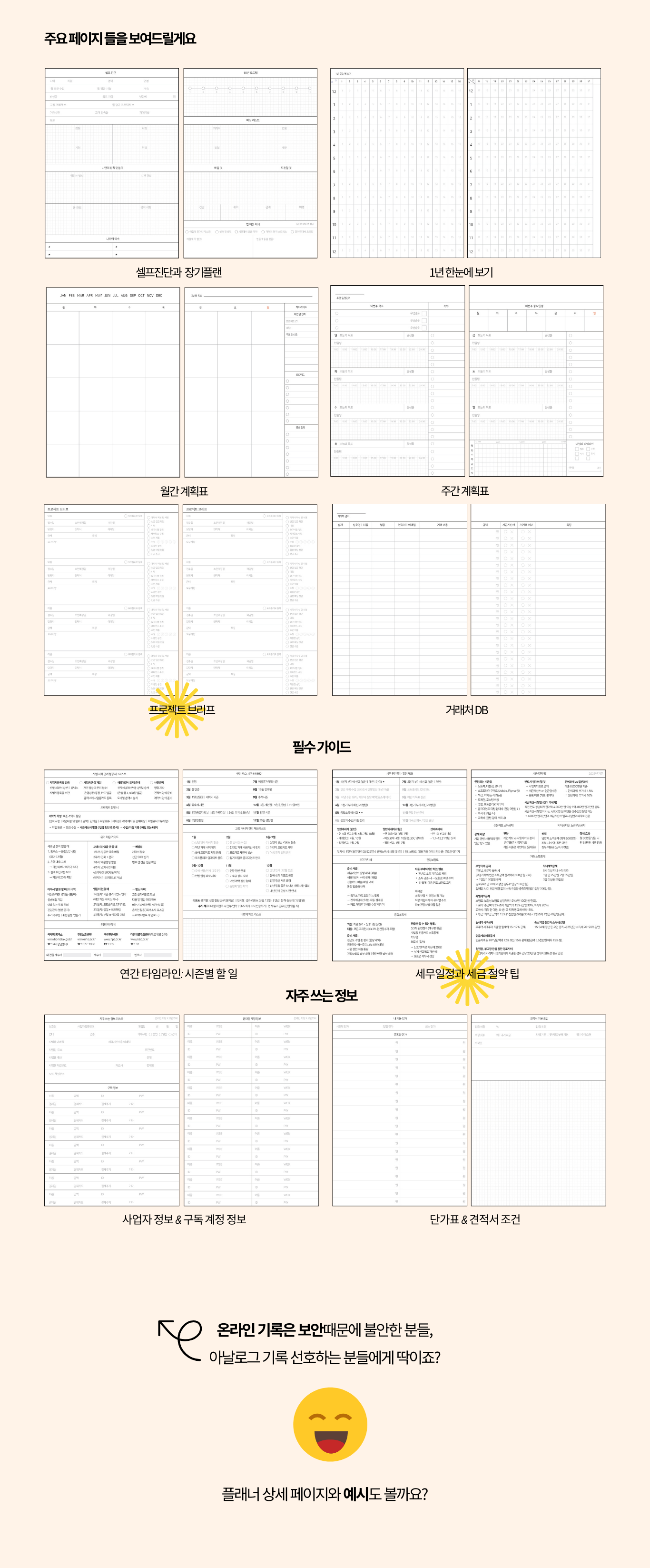 이 페이지에는 연간 목표와 타임라인을 한눈에 볼 수 있어요. 수시로 들춰보면서 "아, 맞다 이거 해야지" 상기시킬 수 있게요.