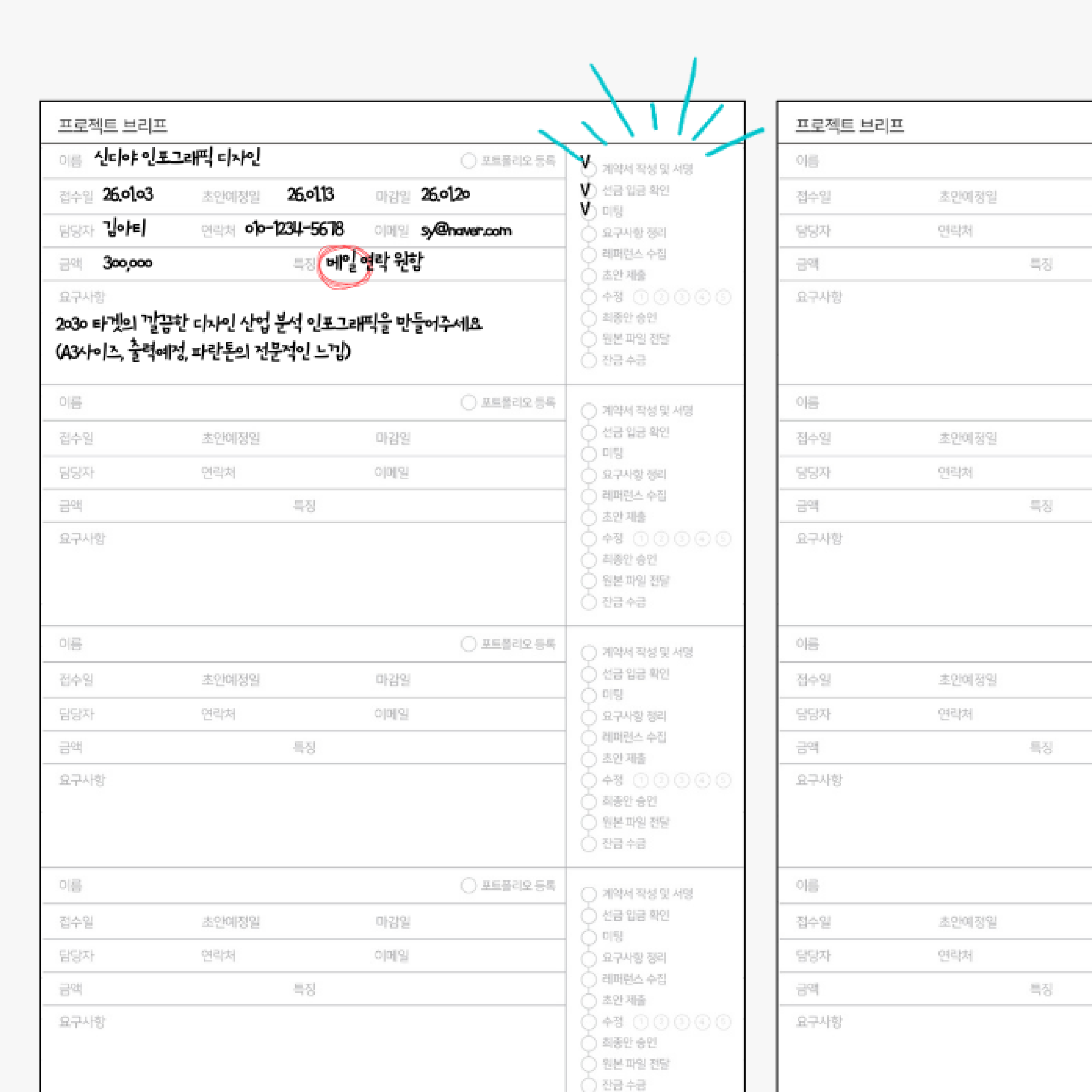 특히 프로젝트 브리프 짤 때, 클라이언트 니즈를 손으로 쓰면서 "아, 이 사람이 원하는 건 이거구나"